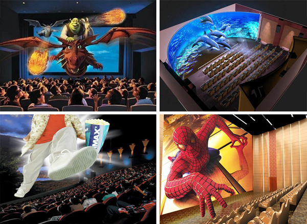 • 4D影院随着娱乐技术的发展和娱乐市场的需求,人们不仅将震动、坠落、吹风、喷水、挠痒等特技引入3D影院,还根据影片的情景精心设计出烟雾、雨、光电、气泡、气味等效果,形成了一种独特的体验。